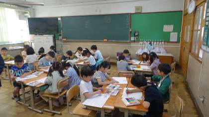 初めてグループ机を作り、楽しそうに話しながら活動していました。