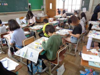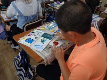絵の具の色をいろいろ混ぜ、指を使って表現しました。絵の具を混ぜることで、たくさんの色をつくることができることを楽しみました。