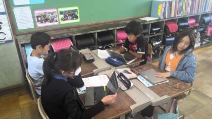 外国語の学習で,自己紹介をしたり得意なことを伝えたりしています。今日はグループのみんなで力を合わせて、6年生が関わりのある先生方と得意なことをつなぎ合わせました。