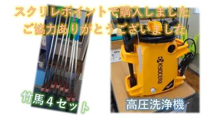 昨年度まで、保護者連絡ツールとして利用してきた「スクリレ」でご協力いただいたポイントを活用して、竹馬と高圧洗浄機を購入させていただきました。みなさま ご協力ありがとうございました。有効に活用させていただきたいと思います。