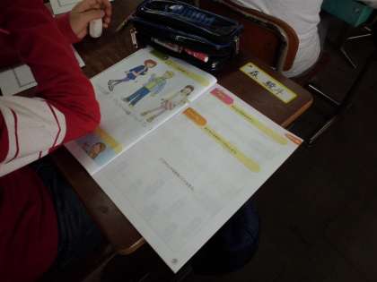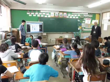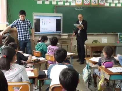 5年生の英語の学習にも中学の英語科の先生に来ていただいています。今年度から中学の先生と担任とでチームを組んで授業しています。アメリカで有名な名前を知ってるかい? トムだ。と先生同士でやり取りします。もちろん英語で。