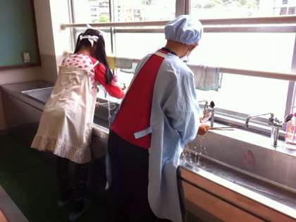 ゆで時間の違うにんじん,ブロッコリー,キャベツ,玉子を手際よくゆであげるためには,班で協力して動かなくてはなりません。手が空いた人は調理器具を洗ったりドレッシングを作ったりします。