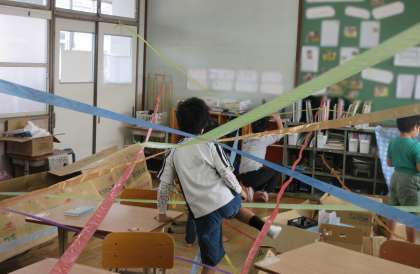 きょうしつにたくさんのスズランテープをつけて
