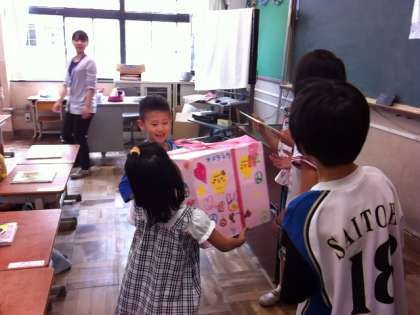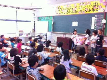 金曜日に控えた「1年生を迎える会」で使ってもらおうと,素敵な帽子を作っていました。リボンや絵で飾り付けたプレゼントとお手紙を持って,1年生の教室に向かいます。