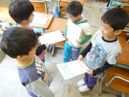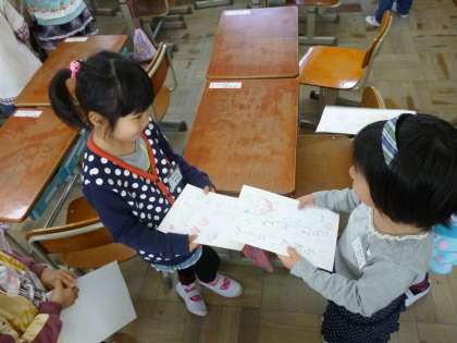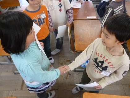 国語科「どうぞよろしく」の授業の様子です。自分の名刺カードを見せて,自己紹介をして「どうぞよろしく。」そして,最後に握手をしています。