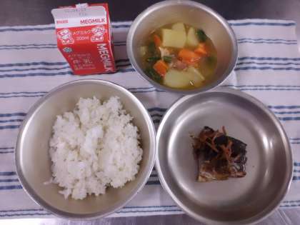 今日の給食は、むぎごはん・牛乳・さばのしょうが煮・鶏肉と野菜の煮つけでした。