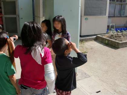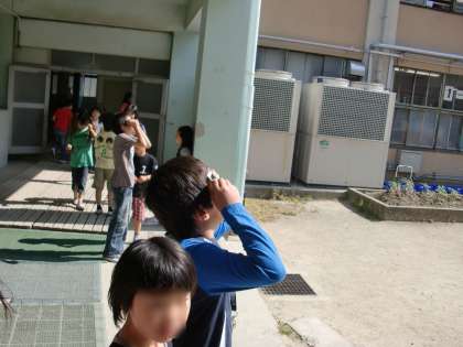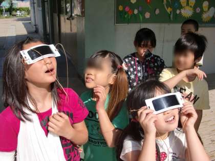 子どもたちが学校に来たときには,金環の状態ではなく,月が太陽に少しかかっている状態でした。