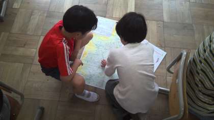 社会科の学習で京都府の地形について調べました。「桂川って聞いたことある!」「半島って何?」「福知山ってあっちのほうやんな」と友達とたくさん話しながら地図を広げました。一生懸命に見つけました。