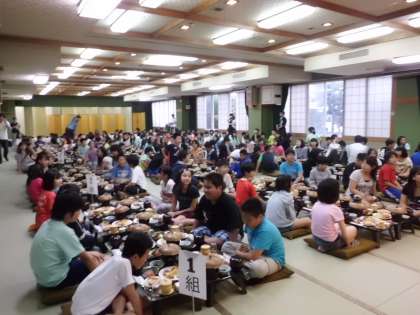 楽しかった地引網も終わり、今日宿泊するホテルに着きました。入館式を済ませて、さっそく夕食です。行儀よくいただきますをして、お料理をいただきました。途中で、獲れた魚のから揚げとゆでたたこをいただきました。おなかいっぱいになりました。
