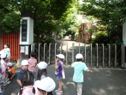 3日目の校区探検では,山の方に向かって歩いていきました。岩屋神社や橘大学,保育園などを見て回りました。