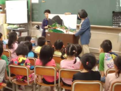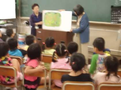 読書ボランティアの方に読み聞かせをしていただきました。今回は1年の3,4組です。大型絵本を子どもたちは真剣に聞いていました。