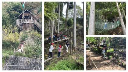 冒険の森でアスレチックを楽しみました。小さな小川で生き物探しをする人もいました。