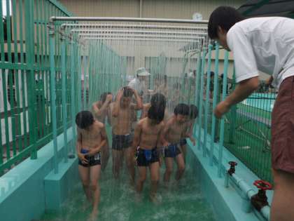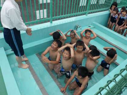 いよいよ水遊びの季節がやってきました。まだ,肌寒い日もありますが,元気に水をかけたり,潜ったりして遊んでいます。1年生の時と比べると,ずいぶん泳げるようになってきている様です。まだ,水に慣れていない子も一生懸命顔をつける練習をしています。