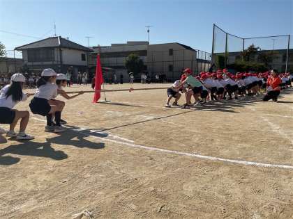 午後からのプログラムがスタートしています。天気もよく、少し暑いくらいですが、競技も熱くもりあがっていますよ!たてわりの団体競技が続きます。まずは、つなひきです。