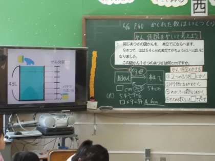 同じく新採1年目の算数の授業を公開しました。「かくれた数」を求める問題で、子どもたちにとってわかりにくいところです。デジタル教材を作成し、イメージを持たせる工夫をしました。