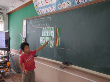 今回のひっ算は,答えが100をこえる計算を学習しています。初めは,計算棒を使って計算の仕方のイメージをします。一の位からのくり上がりも,十の位からのくり上がりも両方忘れない様に気をつけています。