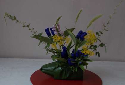 350mlのペットボトルにバランを巻きつけ,船の形の花器を作りました。秋を感じる萩とリンドウ,おみなえし,学校に咲いていたカクトラノオとエノコログサを生けました。バランスをとりながら生けるのが難しかったです。