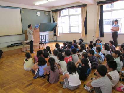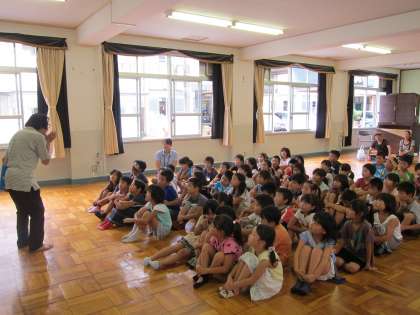 今日は,大石すすむ先生に読み聞かせをしていただきました。普通の読み聞かせとは違って,参加形式だったり,絵本の中から島が飛び出してきたり…子ども達は引き込まれる様に,本を見て聞き入っていました。子ども達は登場人物が「本当に生きているみい!」と感動していました。