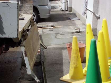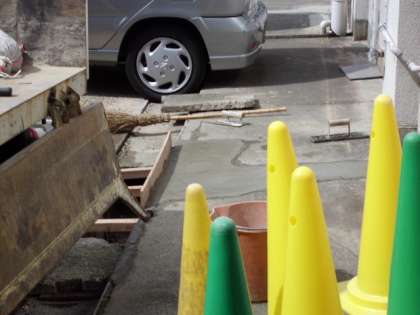 会議室の南側のたたき部分のコンクリートが割れて陥没していました。よく見るとそこには旧水道管や旧ガス管の末端部分が残っていました。安全のために業者による補修を行ってもらいました。