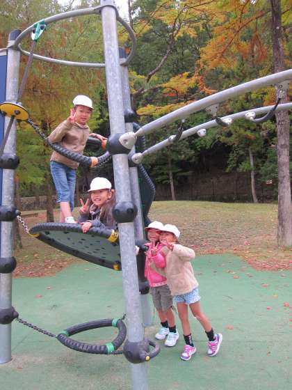 2年生の遠足は,宝が池公園 子どもの楽園に行ってきました。グループで協力してクイズに答えたり,サインをもらうオリエンテーリングをしました。大きな山からのびる滑り台,丈夫な縄でできた大きなタワー,迷路,いつもは遊んだことのない遊具が沢山で楽しんで遊んでいました。途中で雨がパラパラ降ってきましたが,元気よく走りまわっていました。