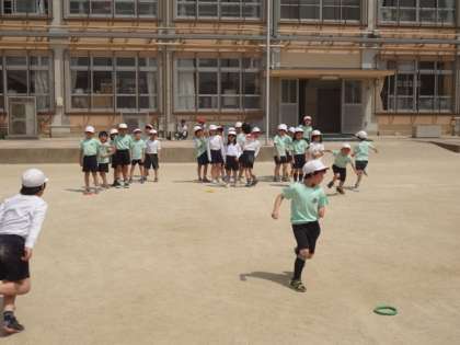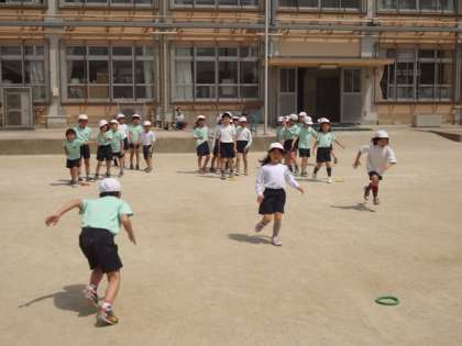 今日は体育でしっぽとりをしました。まず準備としてみんなでリレー形式の競争を短い距離でしました。そのあとしっぽとりをすると、春の日差しにばててしまったのか、みんなグッタリ。保護者の皆さまへ、これから暑くなりますので水筒とタオルの用意をお願いします。