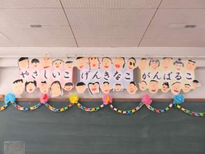 1年生の学年目標が決まりました。目標は『やさしいこ げんきなこ がんばるこ』です。各学級の前面に掲示しようと思います。目標の周りには,学年だより「えがお」に合った子どもたちの似顔絵を掲示しています。23日(火)の参観日に,ぜひご覧ください。