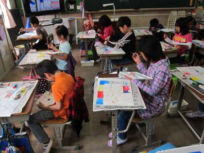 3年生になって初めての図工は,絵の具を使って色々な技法を学習しました。水の量の多い少ないで色の感じが変わったり,筆運びの速い遅いでも,ずいぶん線の雰囲気が変わります。今回,学習した技法が色んな絵を描く時に活用できるといいですね。