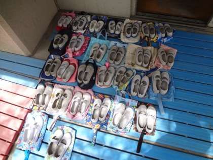体育館でマット運動の準備をしました。入るときは体育館シューズをきれいに並べて、気持ちを整えます。きれいにできましたね。