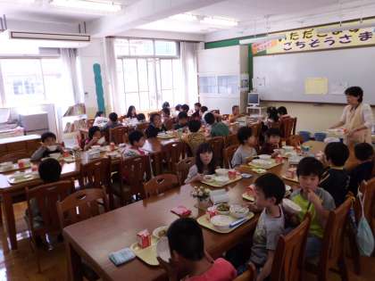 今日は2年1組さんが,もぐもぐルームで給食を食べました。