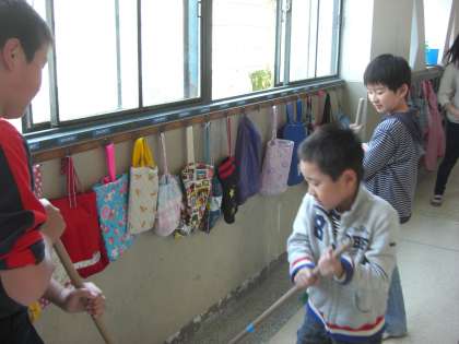 「廊下の掃除はすみずみまでていねいにはくんだよ。」