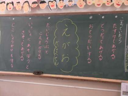 それを受けて,2時間目に「えがおのことばづくり」をしました。1年生のみんなに文章を書いてもらうのは大変ですが,「あの本のように,友だちをえがおにすることって何かな?」とたずねると,