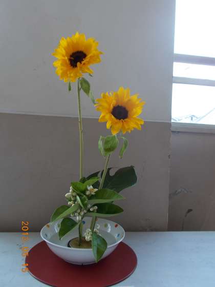 2本のひまわりの高さや,葉っぱ,ハッサクの花とのバランスを,