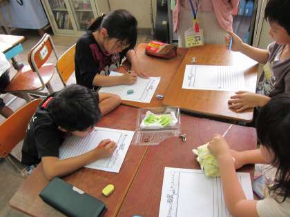 幼虫が動かなくなってきました…「死んじゃったのかな…」と心配する声もありましたが,大丈夫です。幼虫の時とは,ずいぶん形が違うので,驚いた子もいるかもしれませんが,無事にさなぎになりました。でも,中には寄生虫やハチの幼虫にやられてしまっているモンシロチョウの幼虫もいました。一生懸命育ててきたので,何とも言えない残念な空気が流れました…。無事にモンシロチョウとして,飛び立つのはとても難しい事なのですね。
