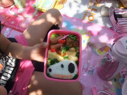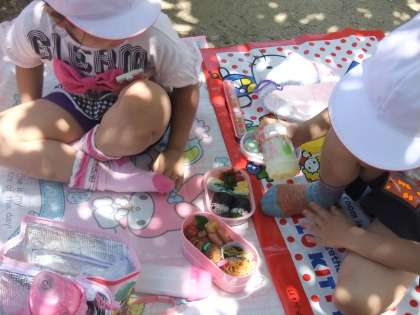 「せんせいー,ぼくの2だんべんとうだよ!」
