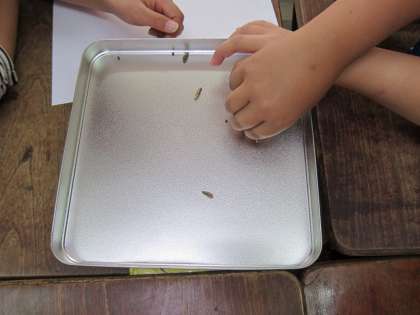 今度まく予定のホウセンカの種と,ひまわりの種を比べて観察しました。手触りが,ザラザラとツルツル…堅くて丈夫なのと,強くつまむと割れそうなのと,それぞれの感覚で観察していました。種は種でも,これだけ大きさが違って,見た感じも触った感じも違うものなのですね。