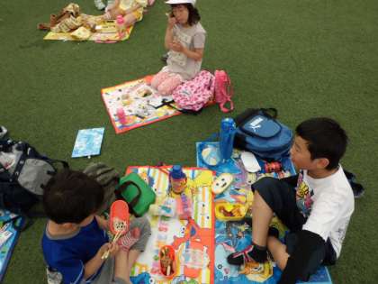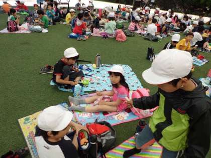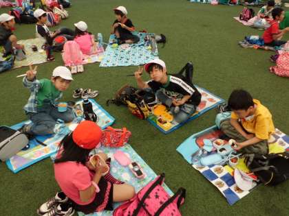 ランチョンマットを屋根付き広場に広げて、友達と話しながらほおばって食べていました。みんなおいしそうに食べていました。