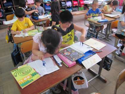 2つの点のうち,1つを固定してもう1つを動かすと,円がかけます。この事を利用したコンパスを使って円をかいてみました。まだ,慣れないので,中心が動いてしまったり,コンパスを傾けてかくというのが難しかったりするようです。今日は,円の「中心」と「半径」という言葉を学習しました。