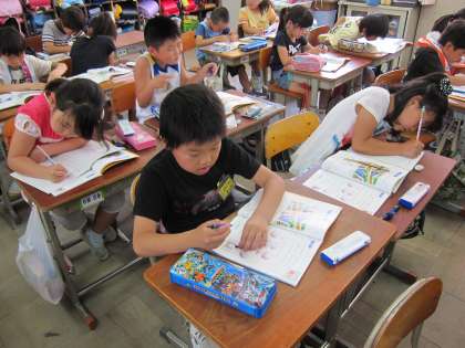 「まっすぐではない,三つの線のうち,どれが一番短いか調べよう!」と言われると,定規・三角定規を使って調べようとする子,ひもを使って調べようとする人,色々工夫をこらしていましたが…「コンパスを使って調べられるかな?」という質問に,ちょっと戸惑っていました。しかし,最後は「なるほど!」と楽しんで,長さを比べていました。コンパスは色んな使い方ができるのですね。