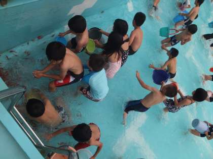 バケツを片手にひた走り,逃げる金魚…追い込まれて必死にもがく金魚を,みんなはとても楽しそうにつかんでいました!