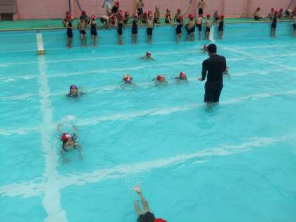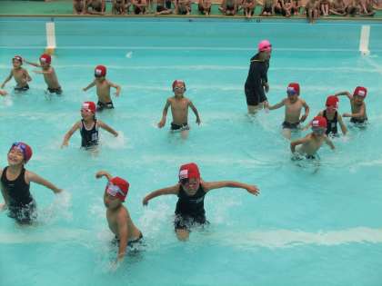 今日のみずあそびは,プールの中で『みずのかけあいっこ』と『プールのなかでかけっこ』と『わにあるき』でした。水に顔をぬれたりすると,びっくりしたり,こわがったりしていたけど,楽しい声がいろいろなところで聞こえてきましたね☆