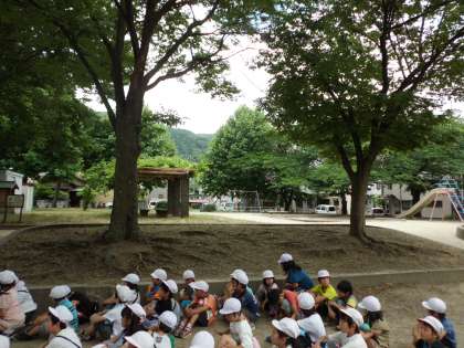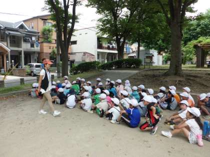 甲の辻公園に到着すると、しっかりと先生の話を聞きます。