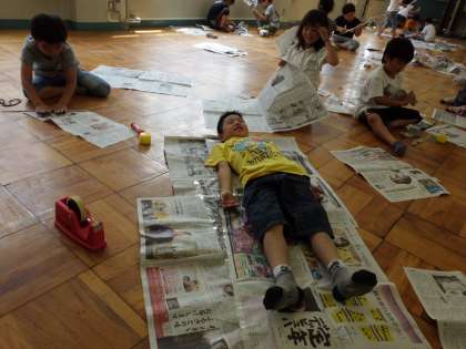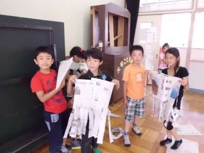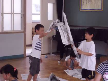 図工で、新聞紙をつかって、思い思いのものをつくりました!