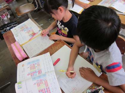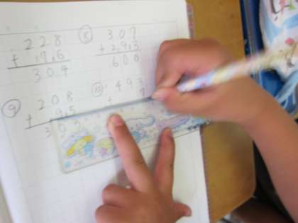 久しぶりの筆算なので,ノートの書き方からおさらいしました。式と式の間は見やすいように間をあける,=を表す棒線は,定規を使ってていねいに引くなどを確認しました。