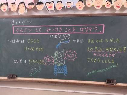 あさがおを観察して,スケッチした後に,友だちとあさがおの様子について交流します。とは言え,1年生はまだまだ上手に伝えることができません。生活科の学習の中では,「友だちにつたえる」ことを目標にして,意見を交流できるように取り組みます。