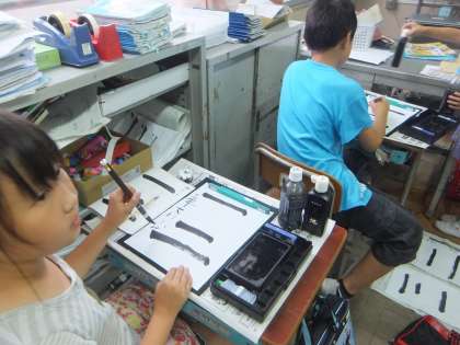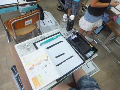 「横画の」筆使いに気を付けて,「一二」と書きました。墨汁を筆にどれだけつければいいのか,筆の持ち方,力の入れ具合など,まだまだ慣れないこともたくさんありますが,授業はシンとした雰囲気で,心を落ち着けて書けています。