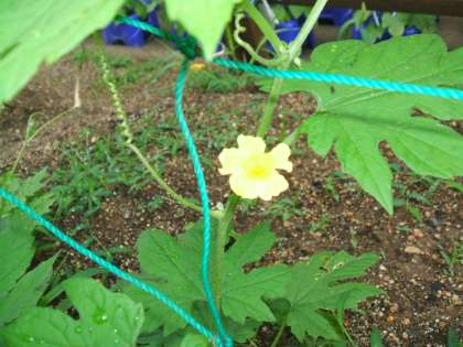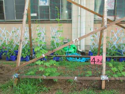 教室で種から育てたツルレイシと苗のツルレイシを4年生の花壇に植え替えて観察しています。随分 成長しました。日毎にのびていっています。今日は黄色い花もつけていました。実がなるのが楽しみになってきました。