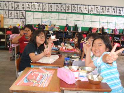 給食は机の向きを向かい合わせにして食べています。クラスの友達とおしゃべりをしながら楽しく食べています。4年生は全体的に残菜も少なく,食缶の中はほぼ空っぽです。明日の給食の献立も気にしています。