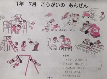 夏休み前に,1年生の安全指導では,学校外の郊外での安全について学びました。京都市では,安全ノートを活用して安全について学習します。絵を見て,どんなところが危険か,よくないのかについてみんなで考えました。