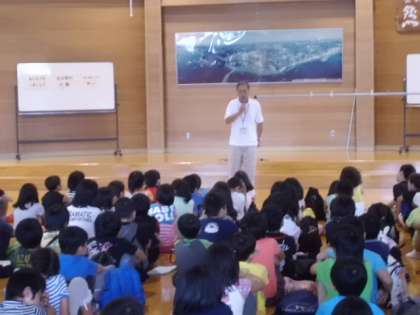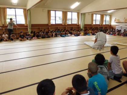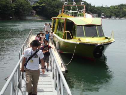 学校を出発して予定通り、賢島に着きました。バスを降りて船に乗って仲良し港に到着。入所式を行いました。その後、東屋でお弁当を食べました。いよいよみさきの家での活動が始まります。