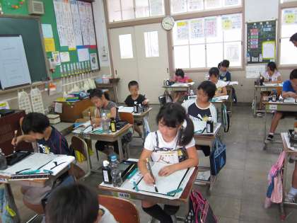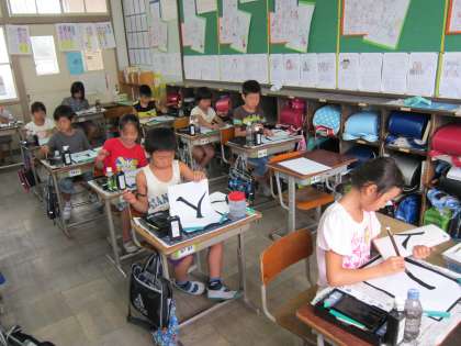 今日は,4回目の毛筆の学習です。今回は,「人」の字を練習しました。左はらいと右はらいの二画ですが,この右はらいが,とても難しかった様です。左はらいは,「とん」とを置いたあと,左下に「すーっ」と力を抜いてはらいますが,右はらいは「とん」と置き,右下に筆をすすめた後,もう一度「とん」と止め,右に「すーっ」とはらいます。何度も何度も練習しましたので,最後はようやく納得いく字がかけました。